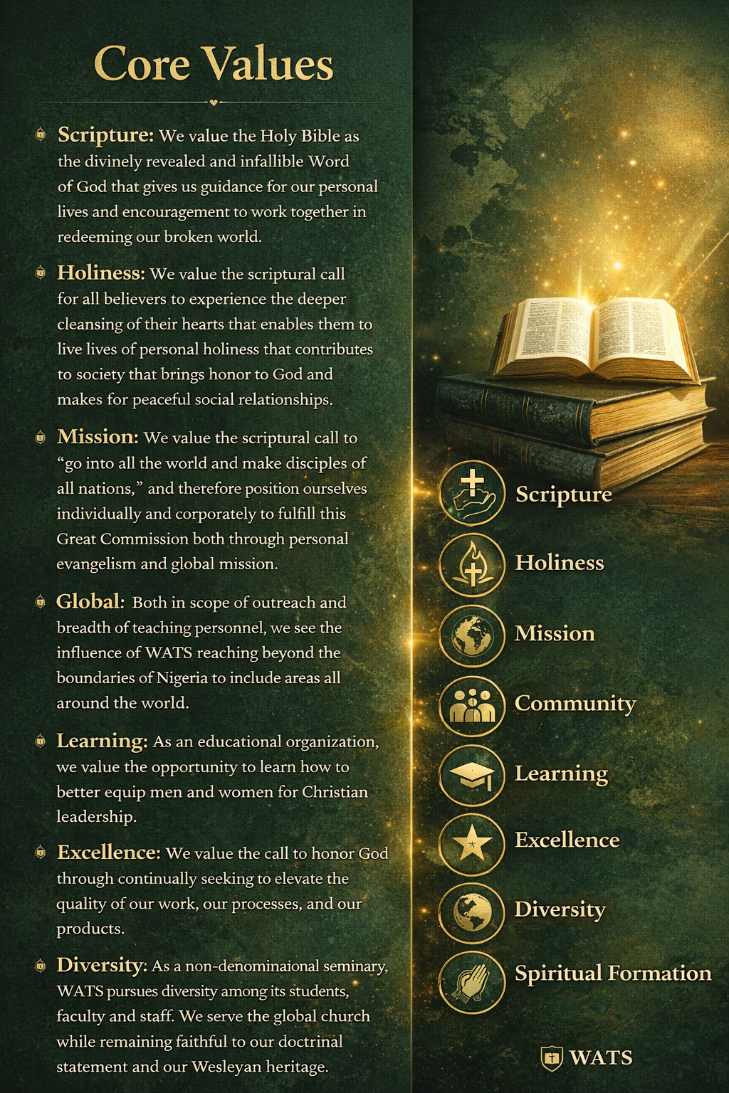 - Diversity: As a non-denominational seminary, WATS pursues diversity among its students, faculty and staff. We serve the global church while remaining faithful to our doctrinal statement and our Wesleyan heritage.